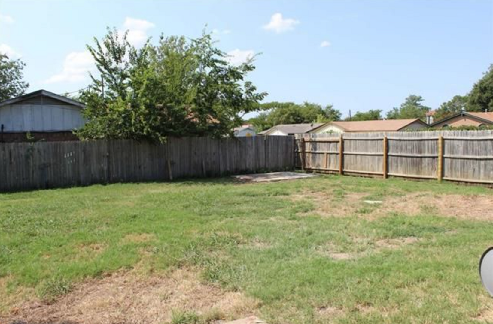 Step outside through French doors to enjoy a large open patio and a huge, fenced backyard, perfect for entertaining, relaxing, or outdoor activities.