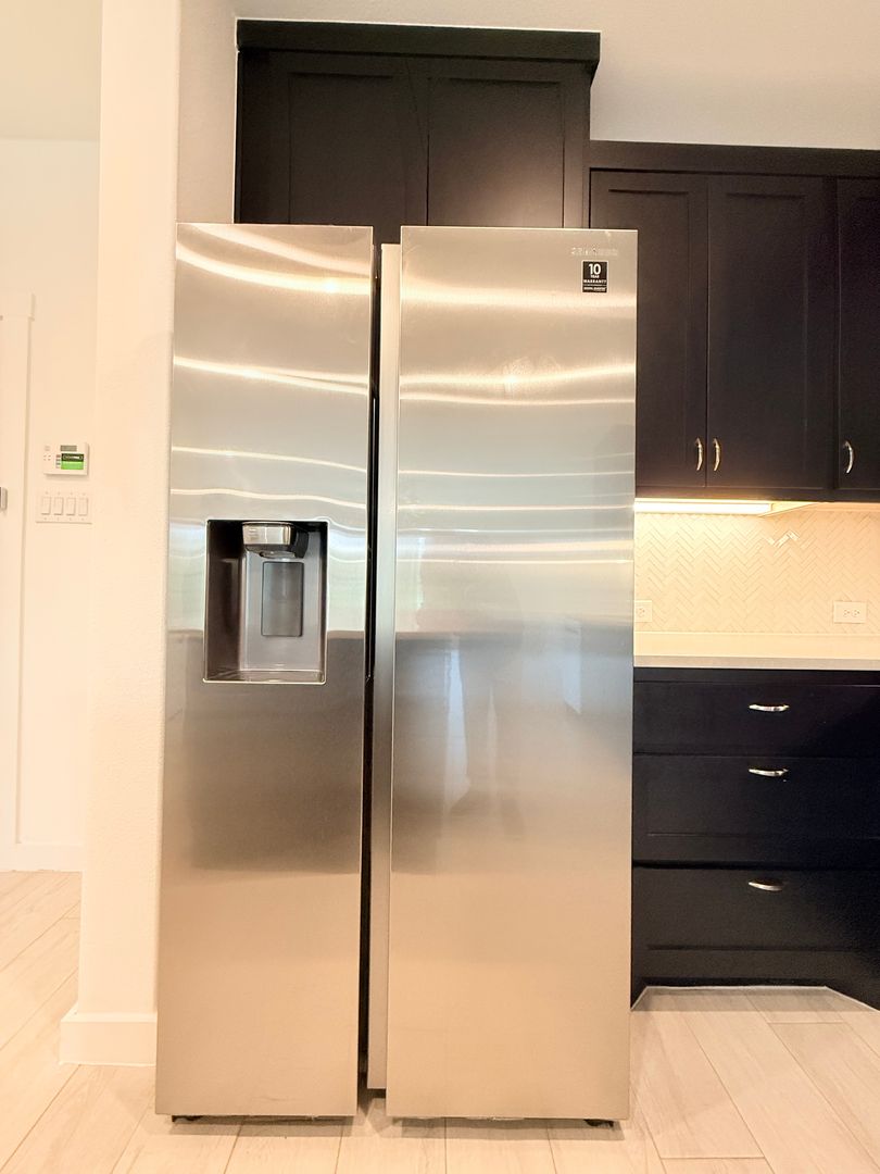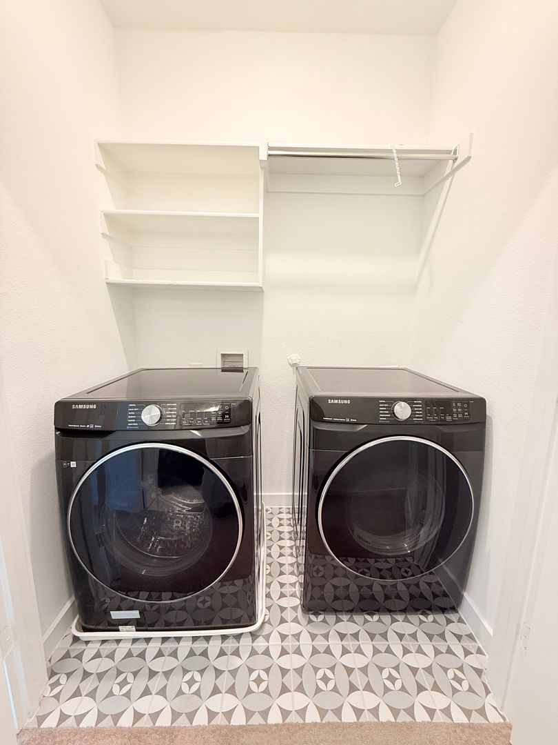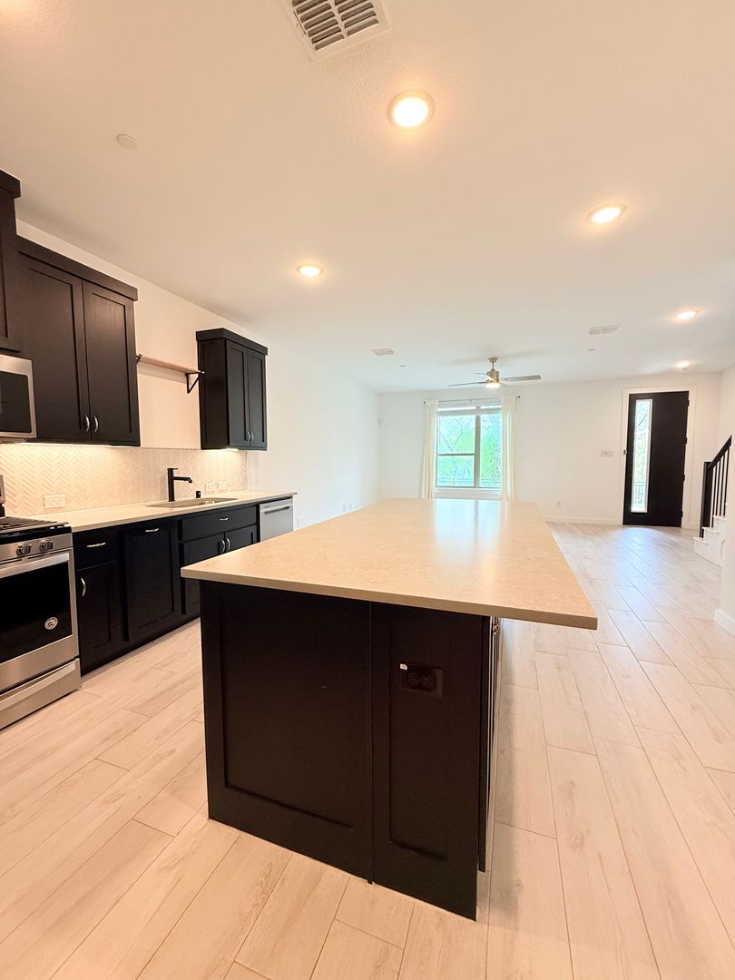 The stylish kitchen features stainless steel appliances, including a refrigerator, dishwasher, microwave, and stove, along with gorgeous countertops and a spacious center island ideal for dining or gathering. For added convenience, the refrigerator, washer, and dryer are all included.