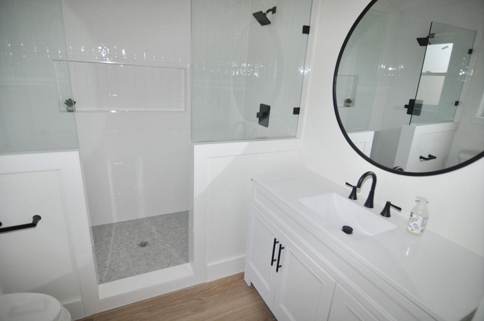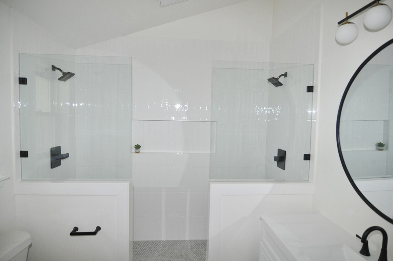 The spacious primary suite offers a beautifully designed en-suite bath with a large walk-in shower featuring dual showerheads and Wi-Fi-enabled lighting and music settings for a spa-like experience.