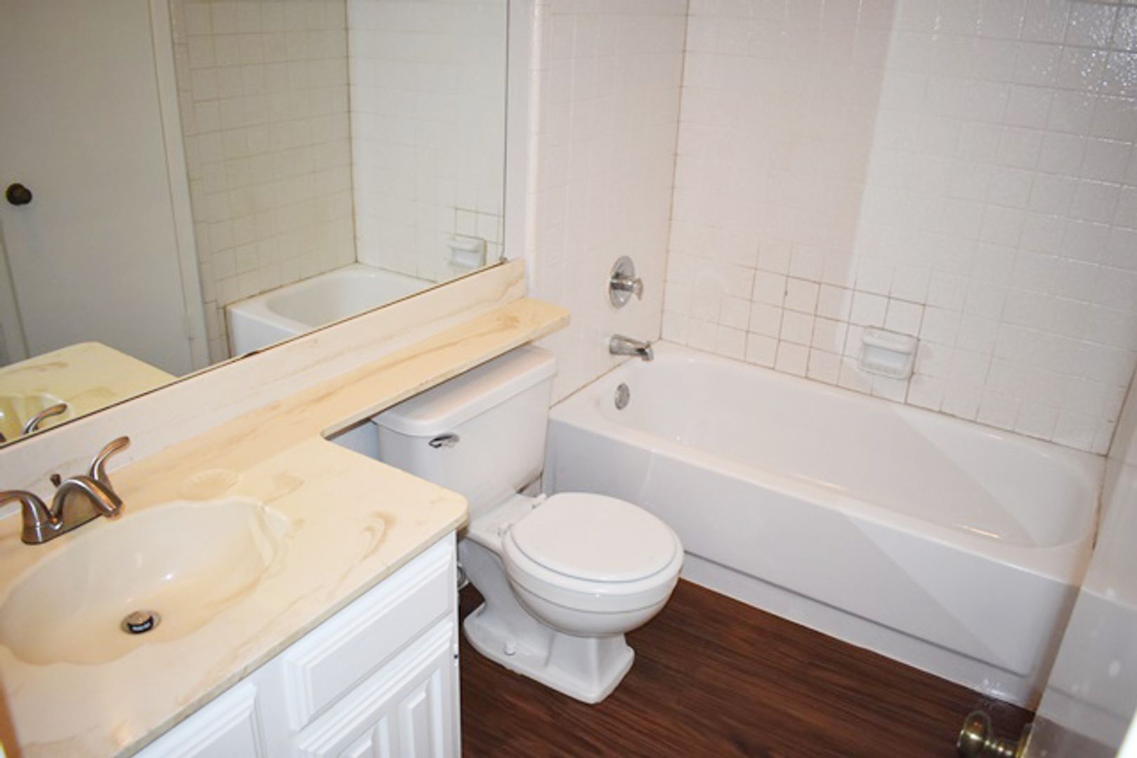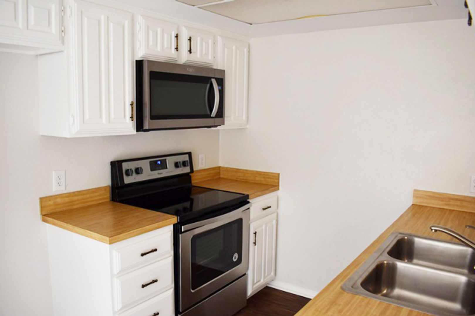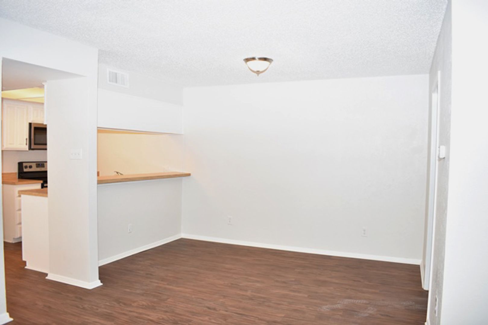 Step inside to find beautiful vinyl plank flooring, neutral paint tones, and a spacious living room highlighted by a floor-to-ceiling classic brick fireplace—perfect for relaxing or entertaining. The adjoining dining area flows seamlessly into the kitchen, which features crisp white cabinetry, stainless steel appliances, built-in microwave, upgraded hardware, and a convenient breakfast bar.