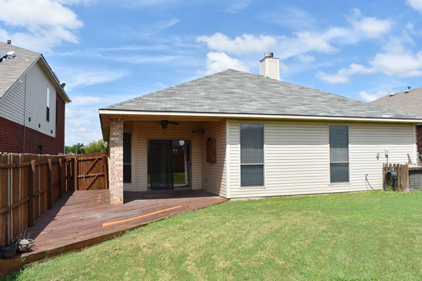 Additional highlights include nicely sized secondary bedrooms, a second bathroom with an extended vanity, and a large backyard complete with a covered patio, deck, and sprinkler system.