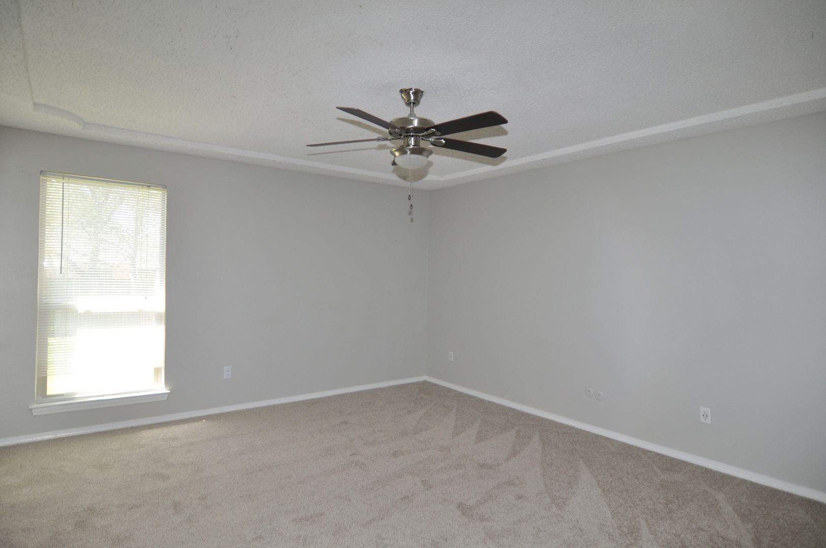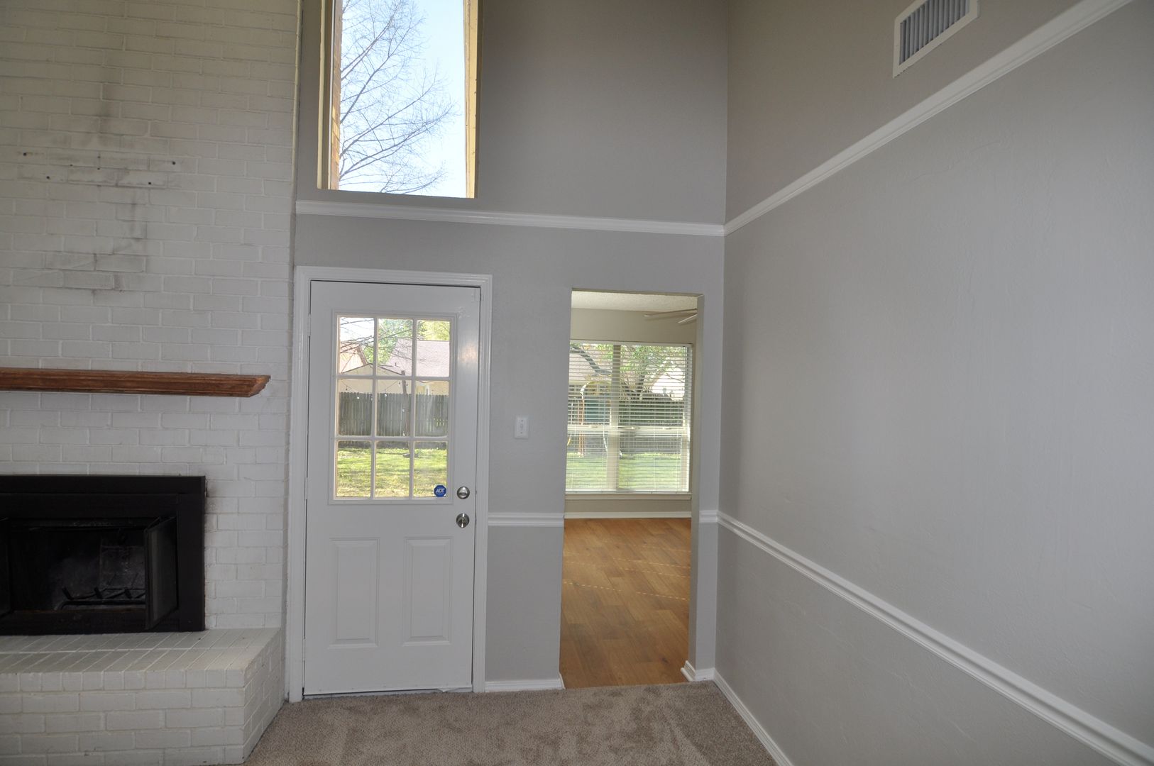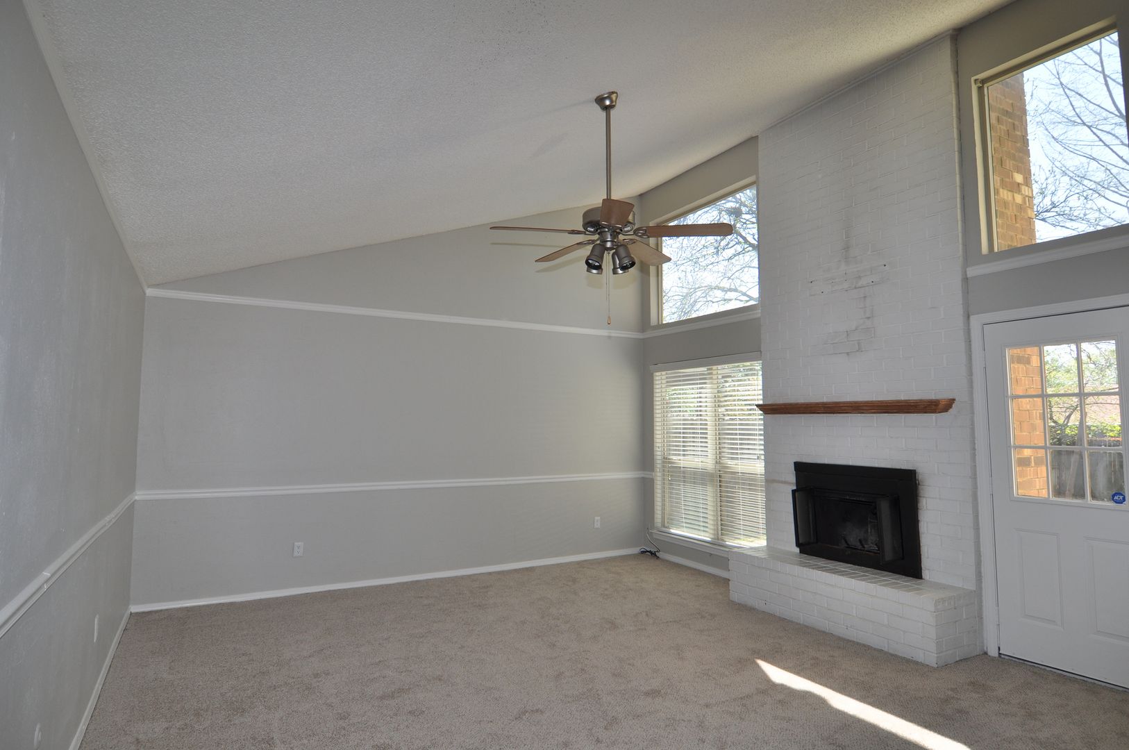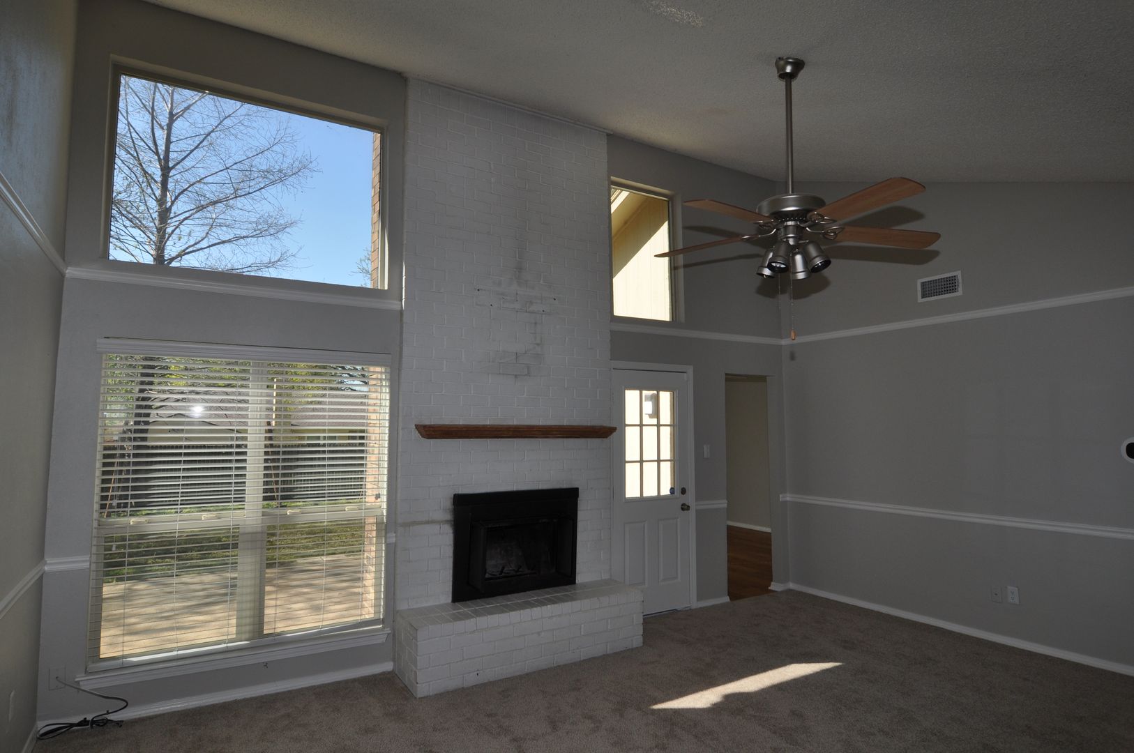 The inviting living room showcases high ceilings, decorative wall molding, and a wood-burning fireplace, creating a warm and welcoming atmosphere. The home features a bright breakfast area and a charming kitchen with white cabinetry. The spacious primary suite offers elegant tray ceilings, while the secondary bedrooms are generously sized. Both full bathrooms provide ample storage.